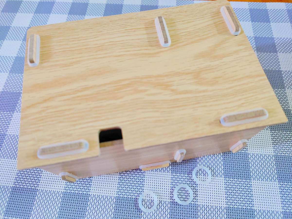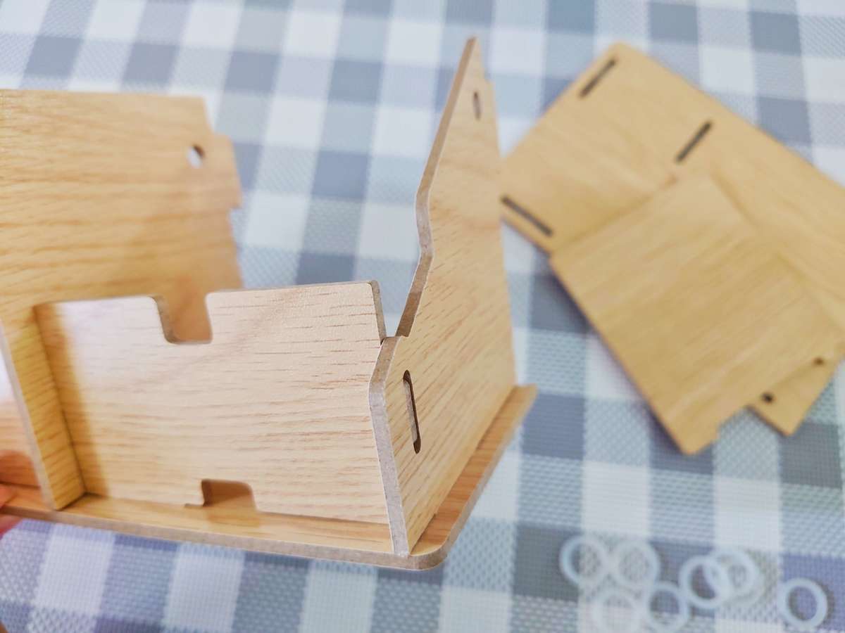 出っ張り部分に輪ゴムをつけると、パーツの板同士が外れずに安定します。