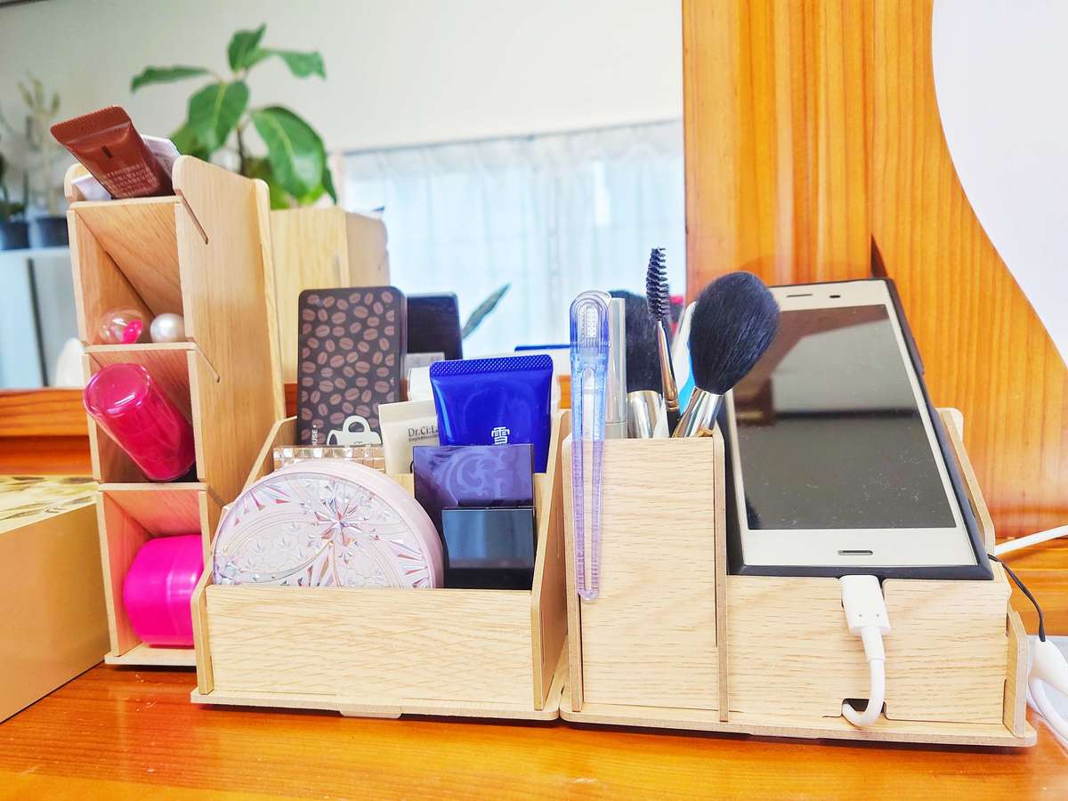 ブラシやマスカラを立て、2ポケットラックにはコンパクトやアイシャドウを整理整頓。