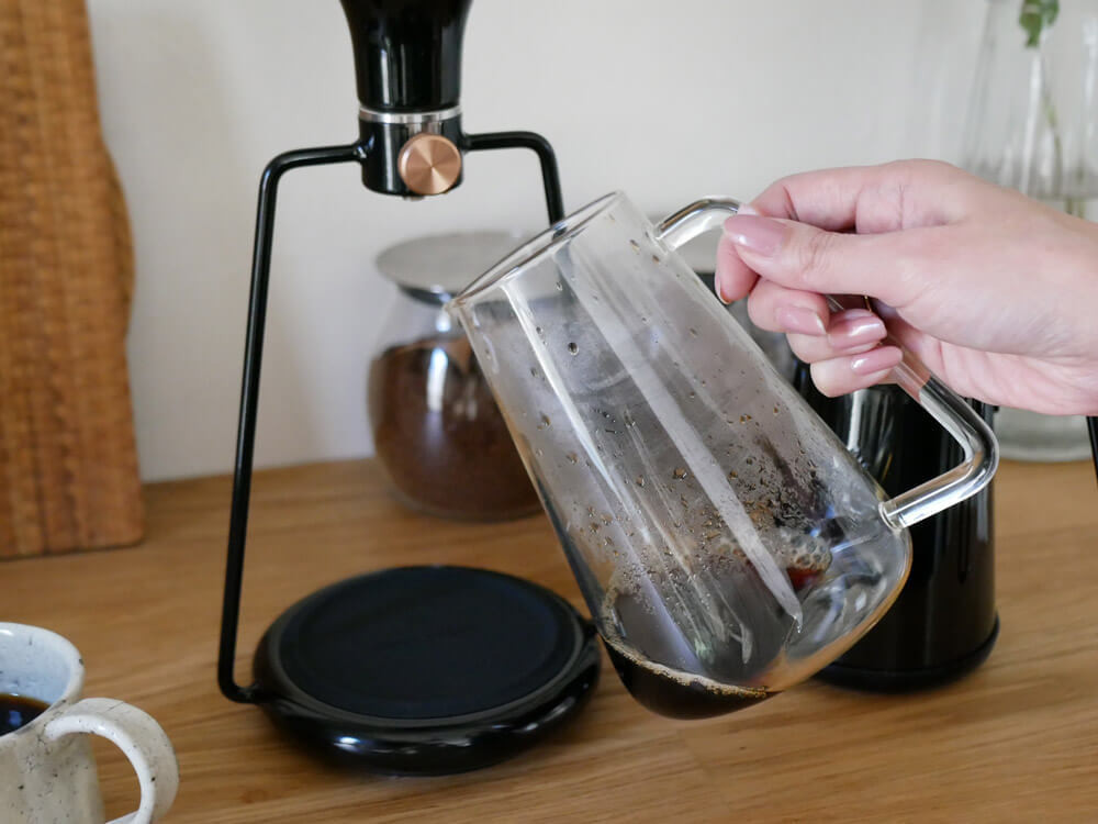 そして耐熱ガラス製のピッチャーは、香りを逃がさない深めの約750ml。男性女性共持ちやすく、ドリンクのハネも気にせず淹れることができますね。