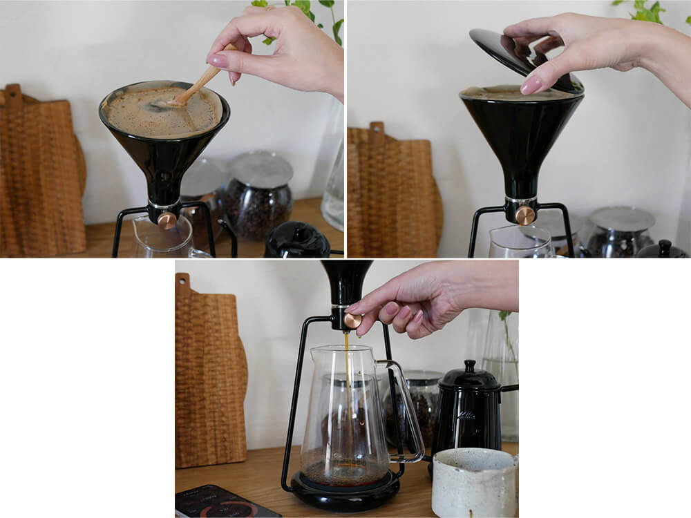 プアオーバー(透過法)、イマージョン(浸漬法)、コールドドリップ(水出し)のどの抽出方法にも対応でき、バルブのつまみを調整することで、お好みのドリップ速度で淹れることが可能です。
