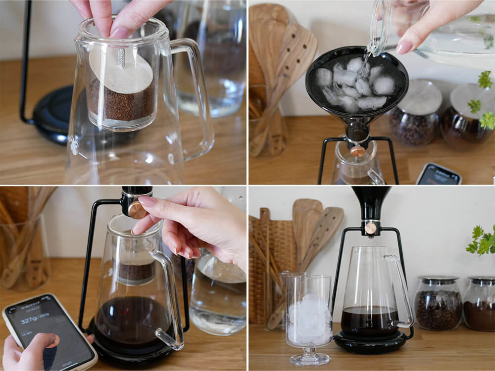 コールドドリップグラスをピッチャーにセット。挽いた豆をファネルに入れ、アプリを使って粉を測ります。その粉をコールドドリップグラスに入れ、専用のフィルタでフタをします。その上から水を少量くぐらせます。