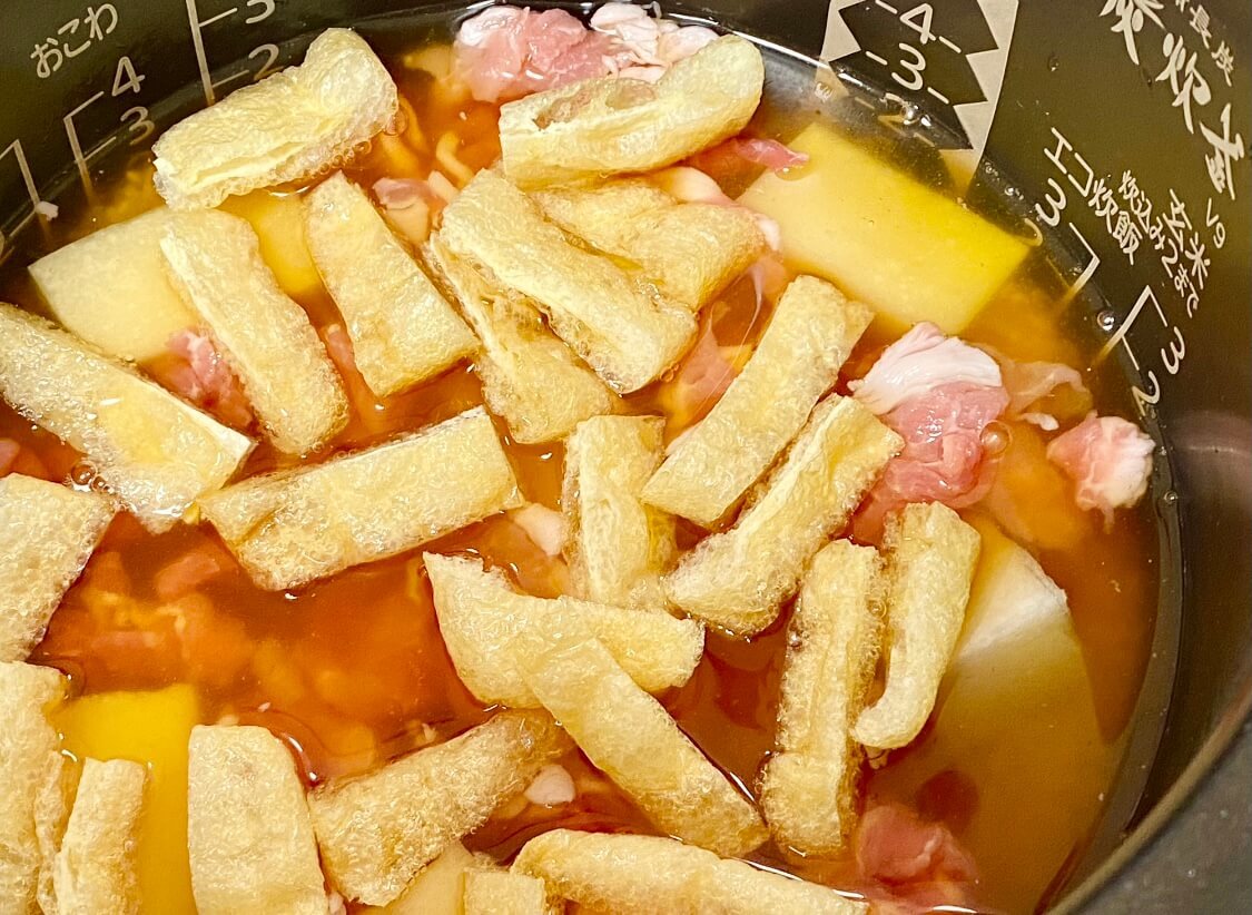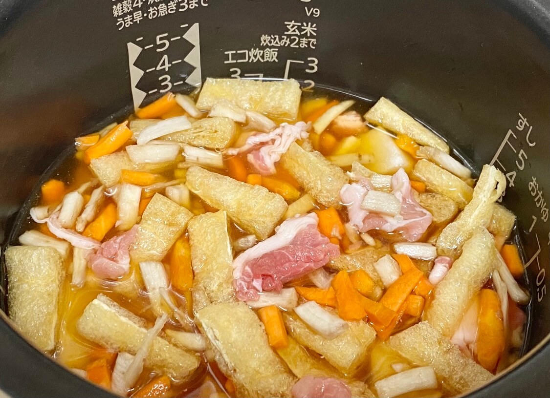 お正月に余って冷凍していた角餅と、炊き込みご飯でよく使う具材と、調味料を入れます♪