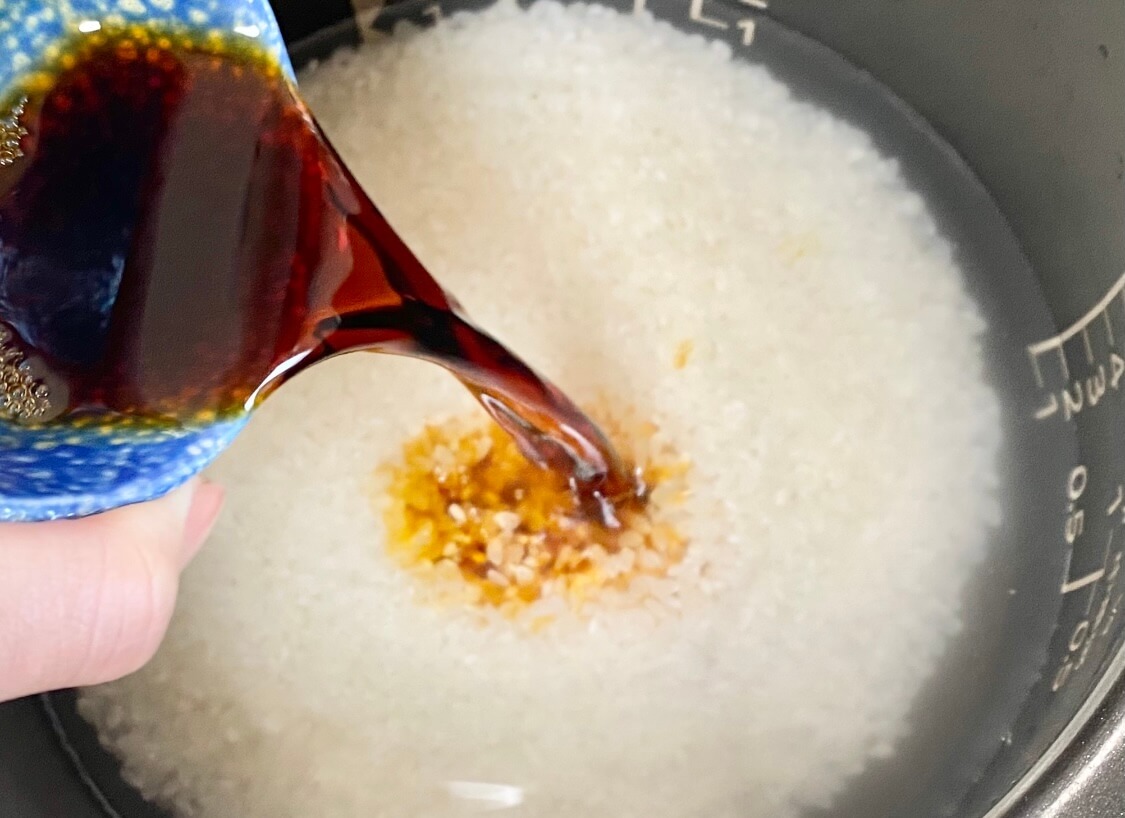 おこわ風炊き込みご飯の作り方②お米を浸水させて調味料を入れる