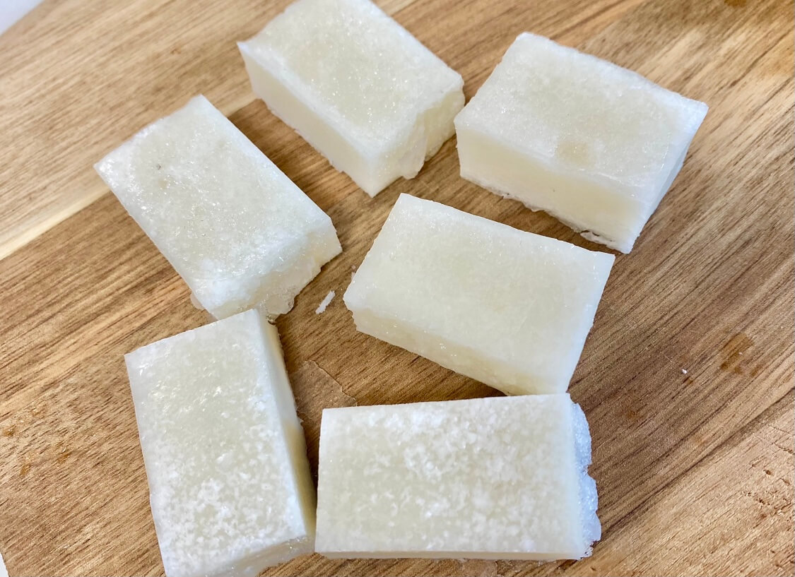 お餅を適当な大きさにカットしていきます。私はツイートのように、1個を6等分しました。