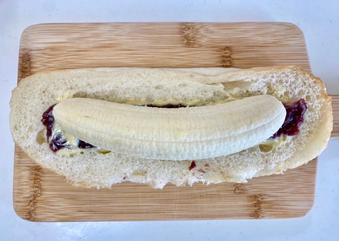 コッペパンのあんこがあるほうに、皮を剥いたバナナを1本まるごと乗せていきましょう!