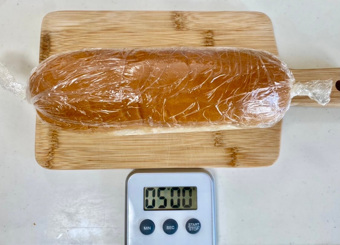 ラップを大きめに切り、コッペパン全体をぴっちりと包み、両端をねじって5分ほど馴染ませましょう!