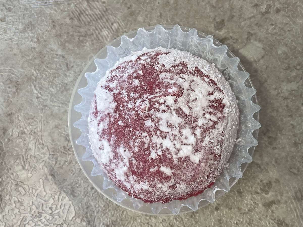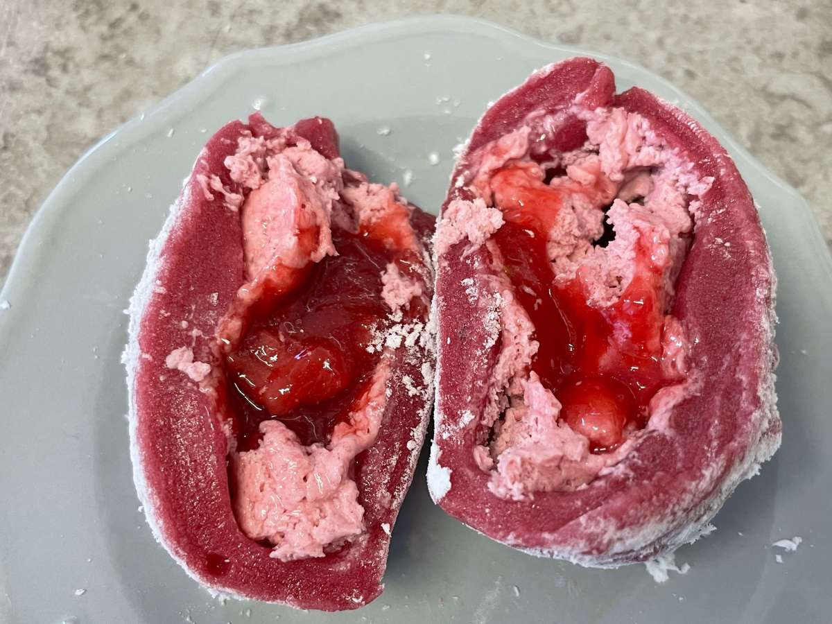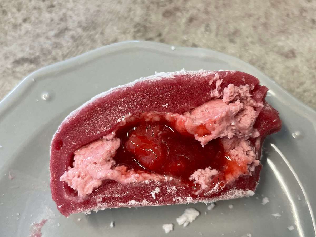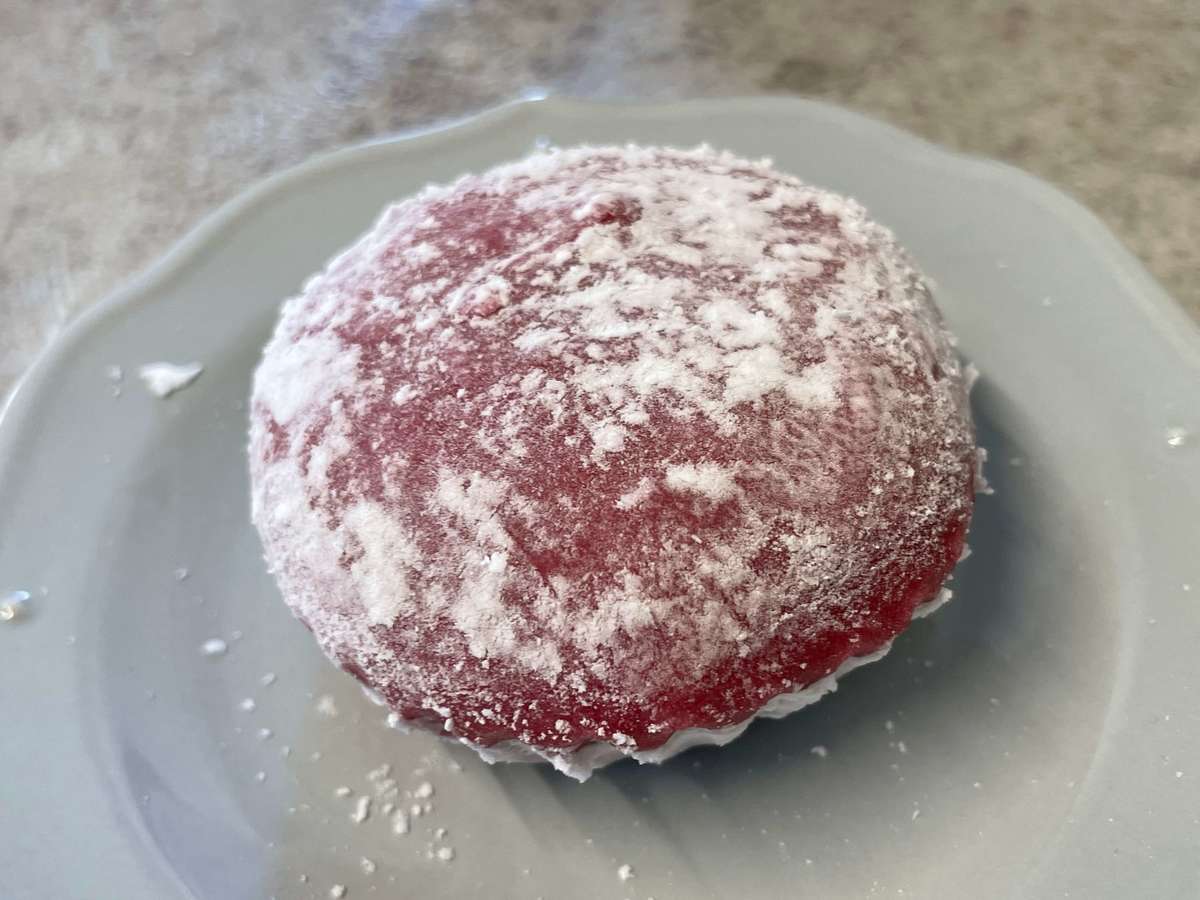 もちもちのやわらかい生地に、とろとろのフランボワーズベリーソースが入っています。
