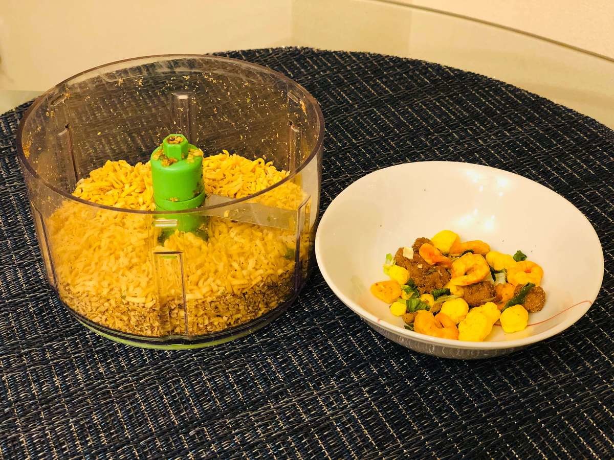日清の公式のレシピでは袋に入れて麺棒で叩いていますが、我が家には麺棒が無いので、フードチョッパーを使用しました。