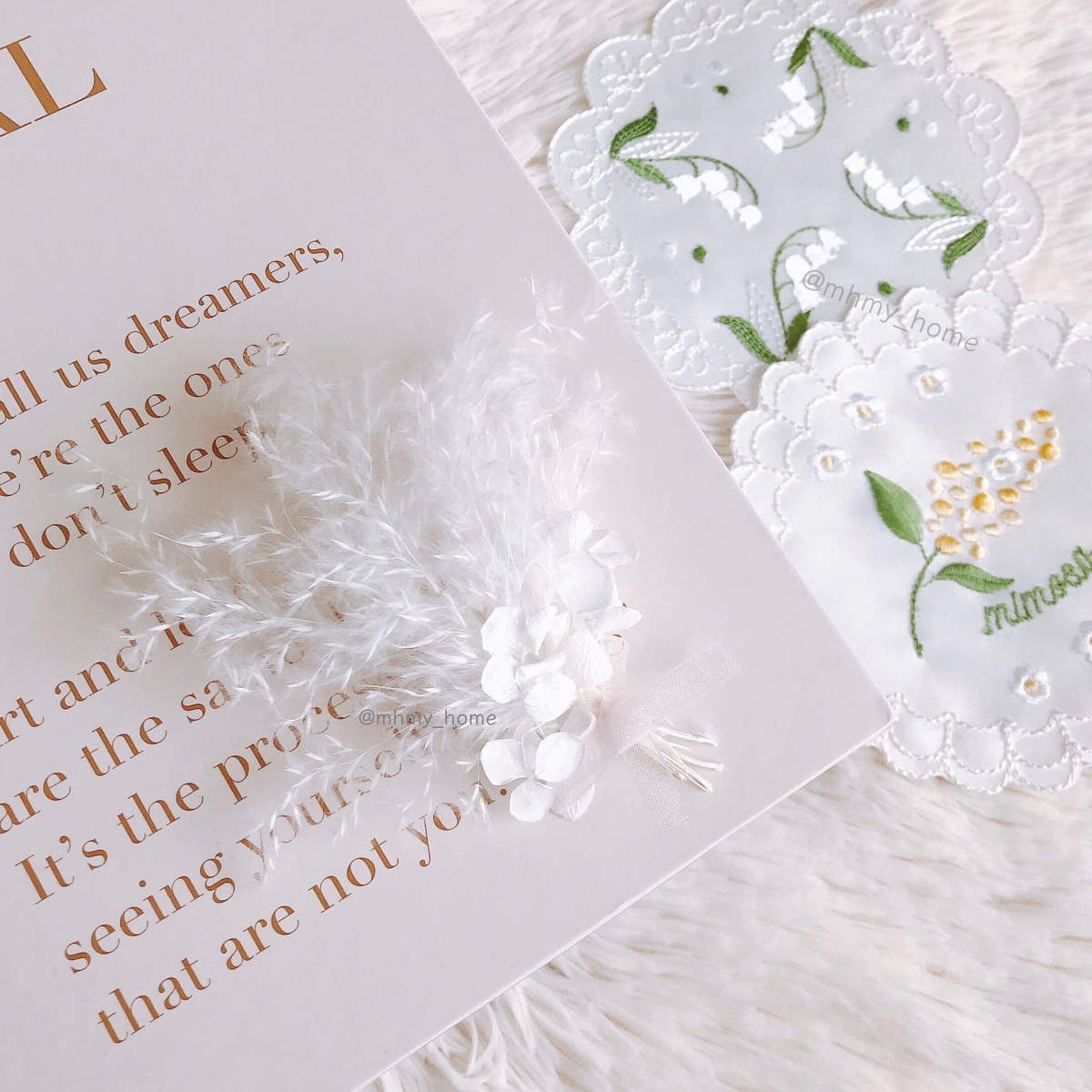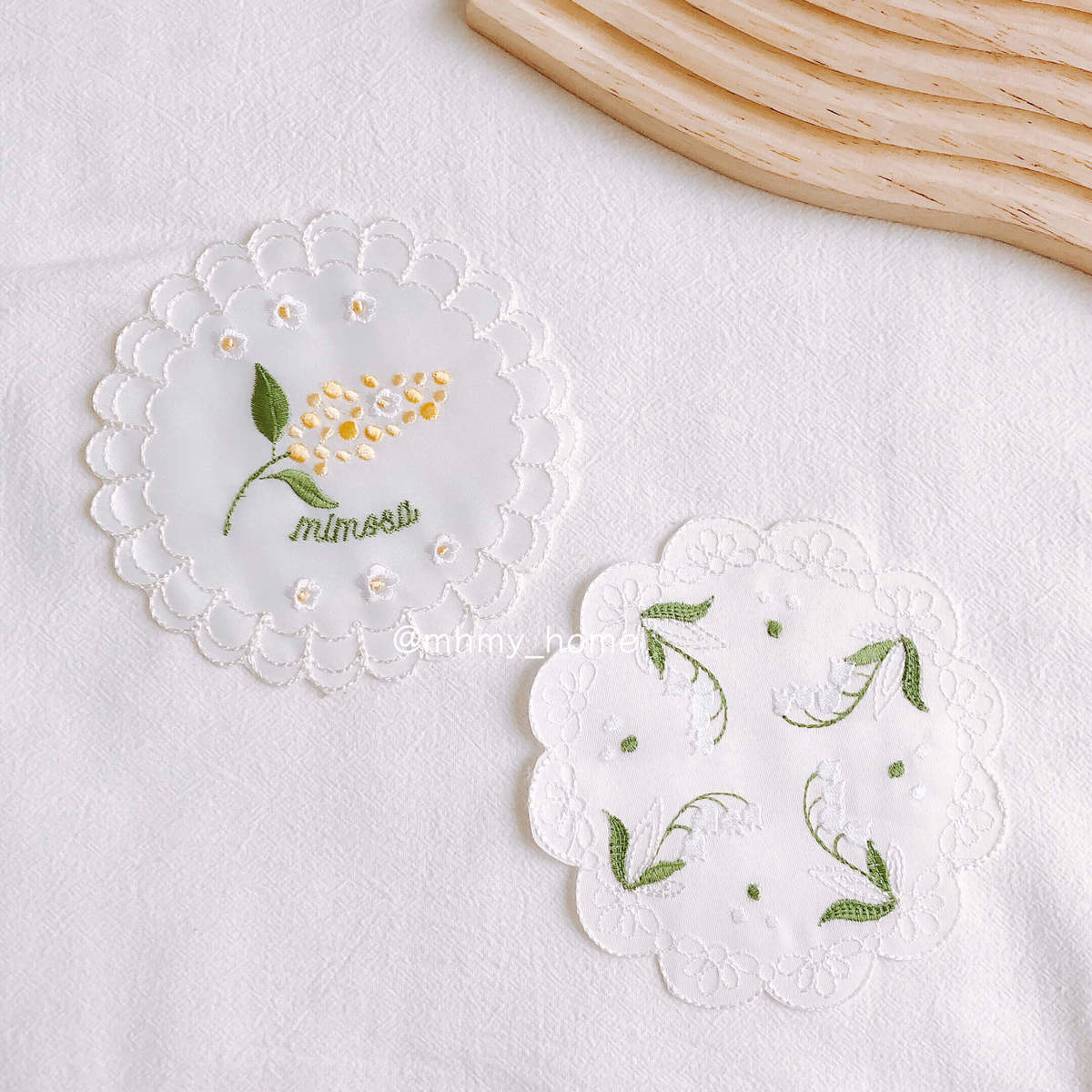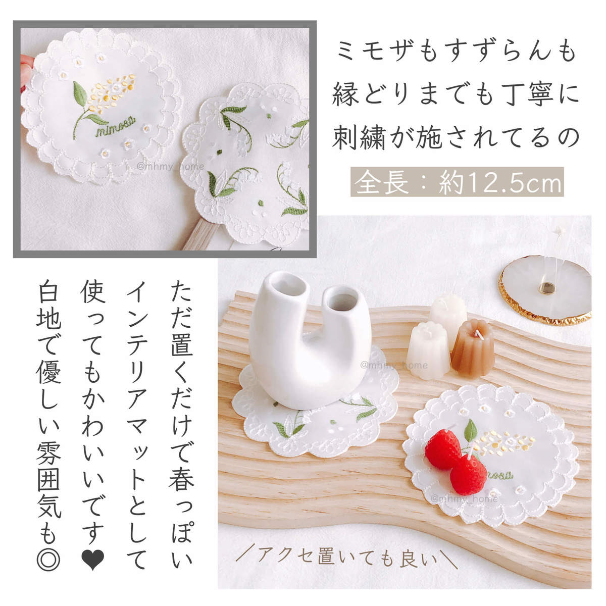 ミモザとすずらんだけでなく、縁どりまで丁寧に刺繍が施されているんです。ただ置くだけでも春っぽい雰囲気になりますし、アクセサリー置いたりインテリアマットとして使ってもかわいいです!白地で優しい雰囲気も素敵ですよね。