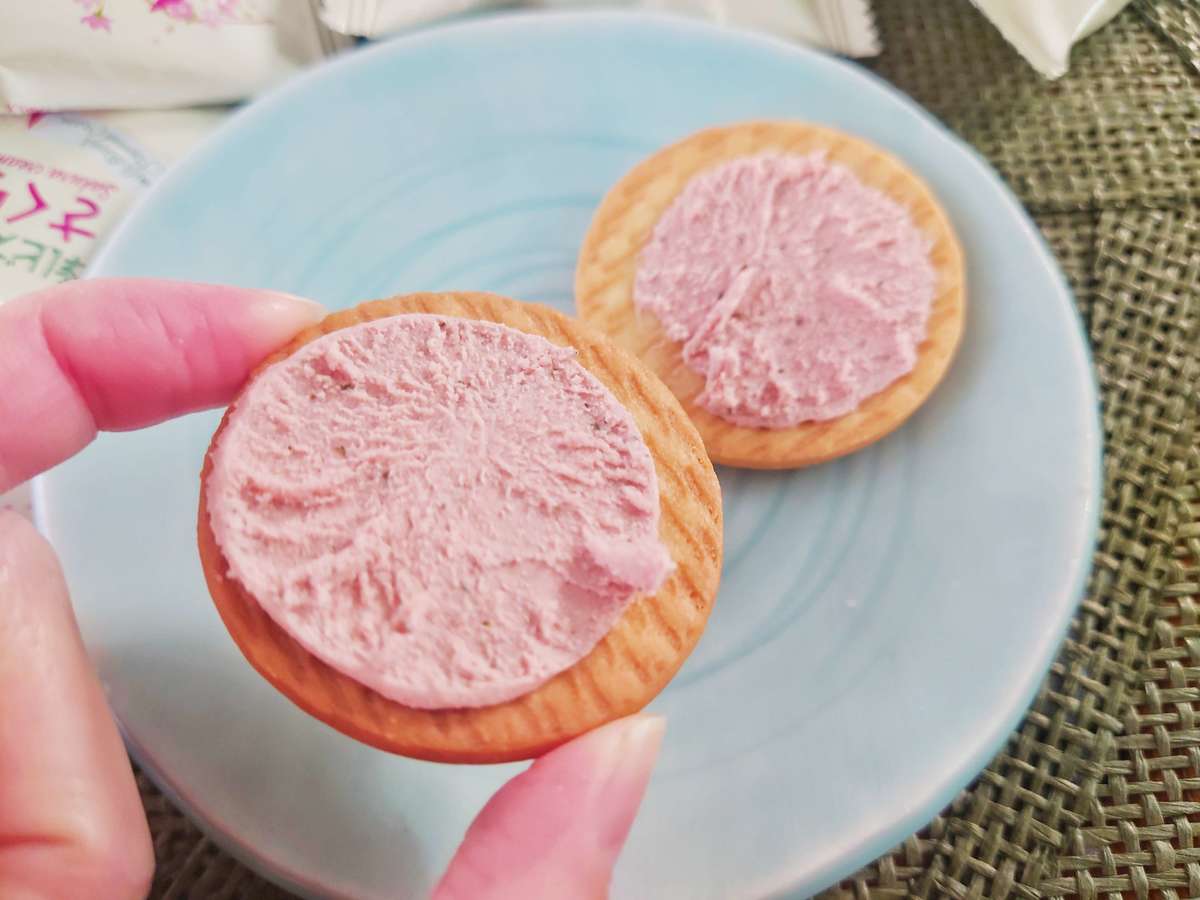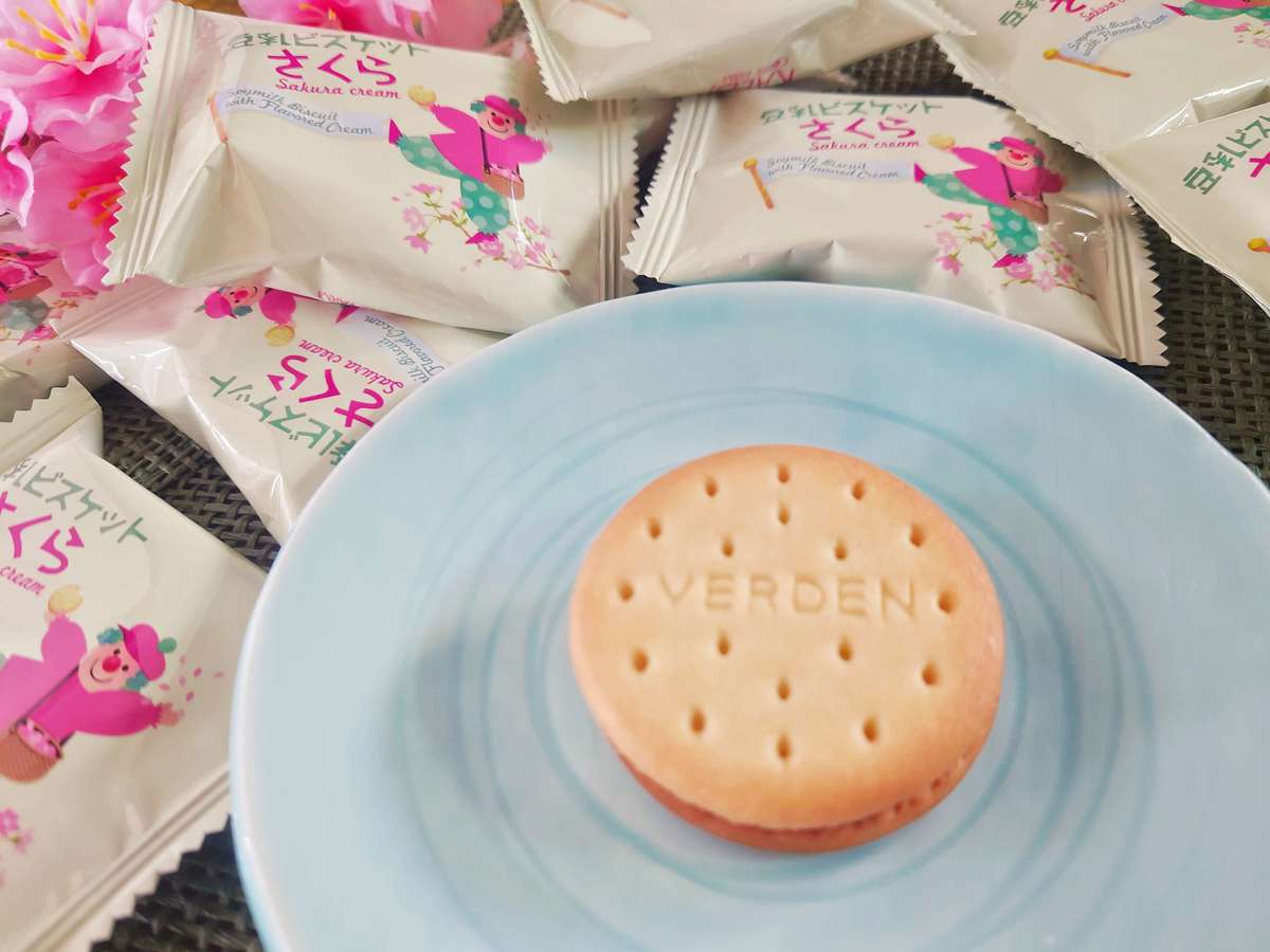 豆乳を練り込んだビスケットに、ピンク色の桜クリームが挟んであります。
