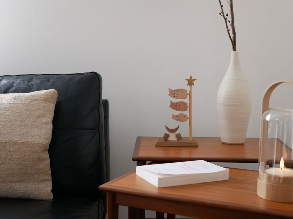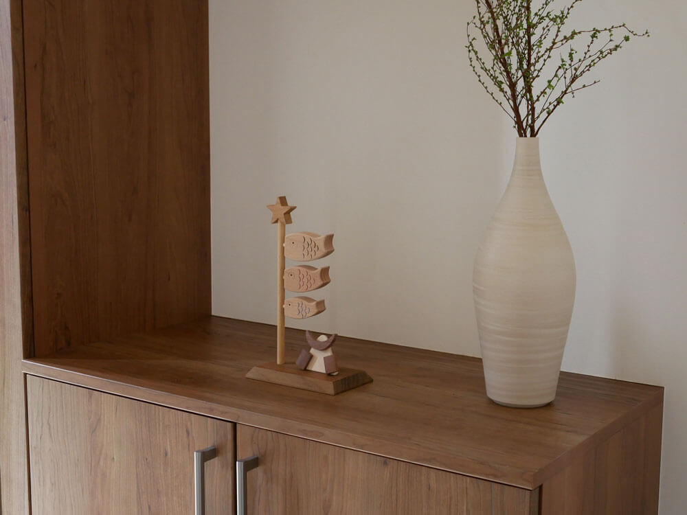 場所を取らずに、現代住宅に合うシンプルな出で立ちで息子さんが居なくともインテリアとして飾りたくなる木製の鯉のぼりと兜のセットです。