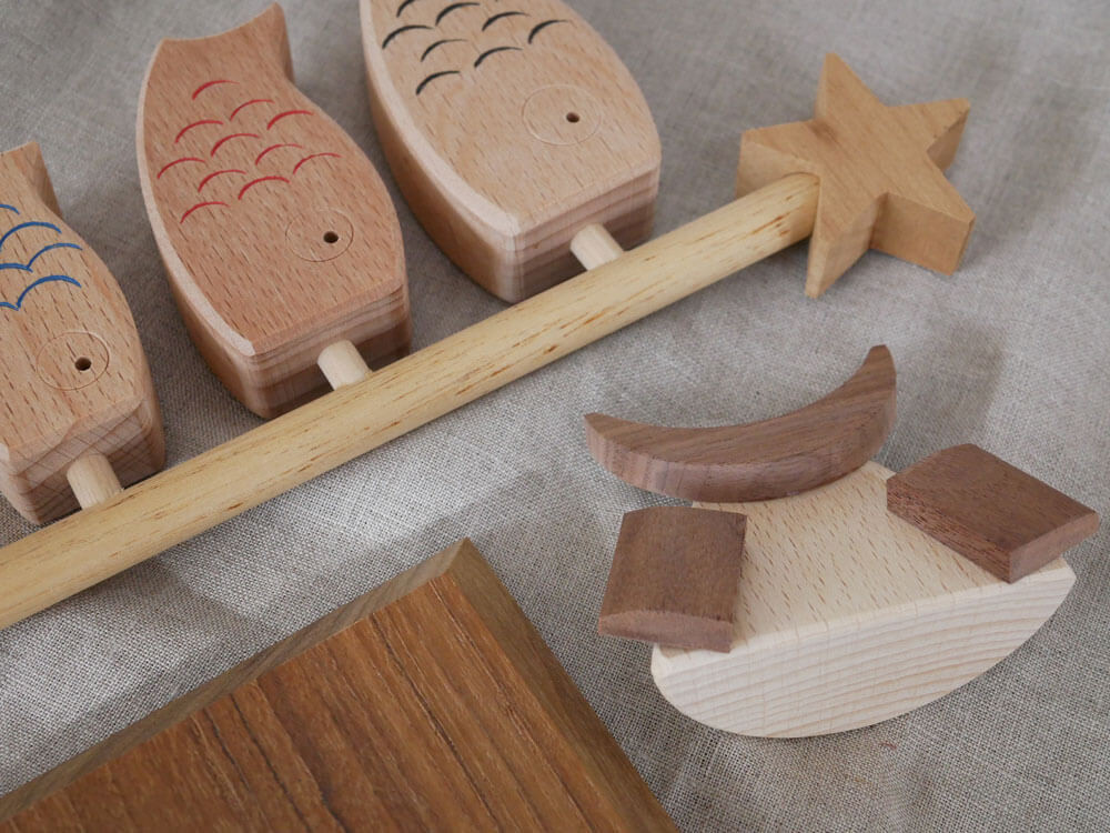 「KOINOBORI&KABUTO」はどこから見ても木の素材。 それぞれ鯉には黒色、赤色、青色のウロコ模様が施されキュートに。それ以外はクリア、無塗装で木本来の温もりも感じられます。