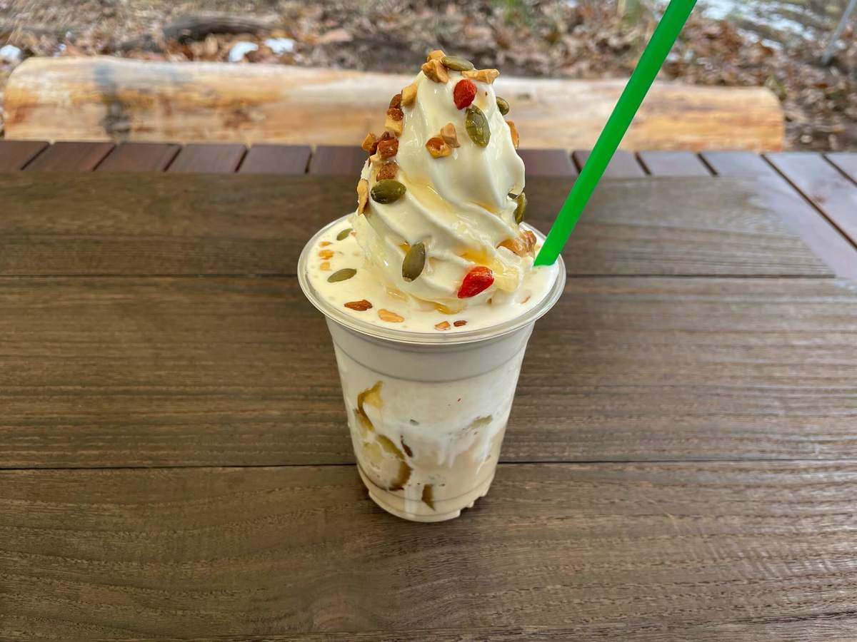 その焼き芋と、市原みつばち牧場さんの名物「ソフトクリーム」で、去年鬼流行りした、スタバの「焼き芋フラペチーノ風」を作っちゃいました。