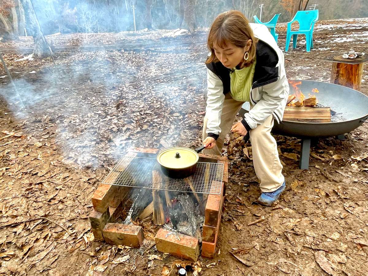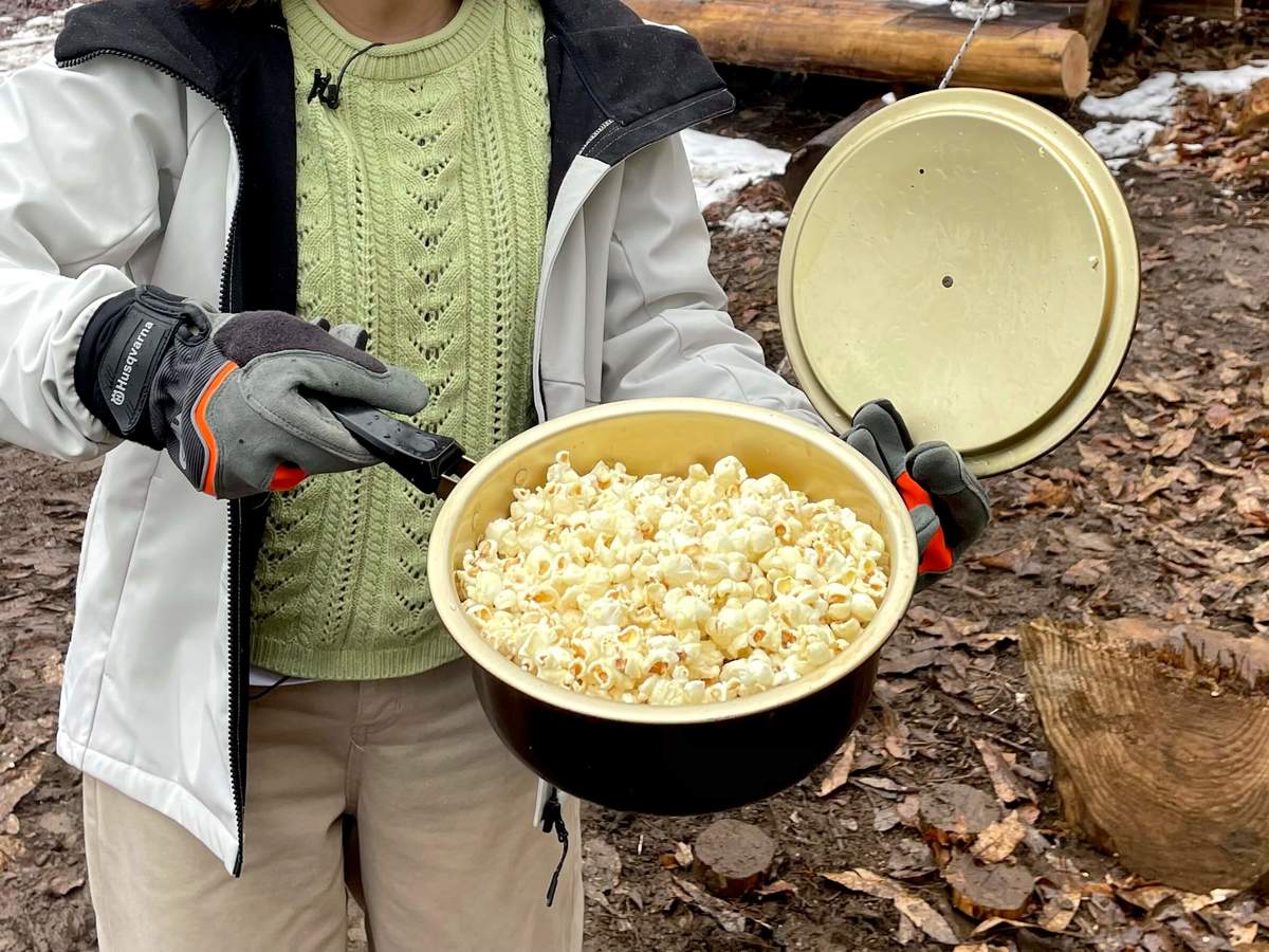 たき火を使った、ポップコーン作りにも挑戦しました。私、ポップコーンって市販のアルミフライパンのものしか作ったことがないんですよね。