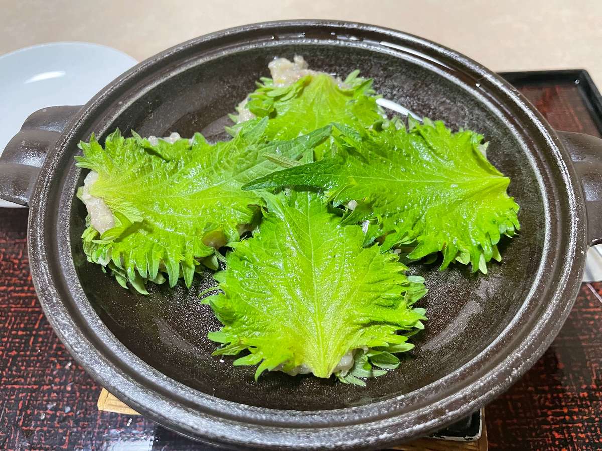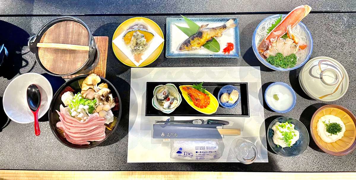 喜代元さんのご飯は、季節の食材にこだわっています。この日の夕食は豆乳鍋、愛知県産のハーブで育てた鮎を使った焼き魚、生で食べられるカニが中心でした。わー、豪華!!