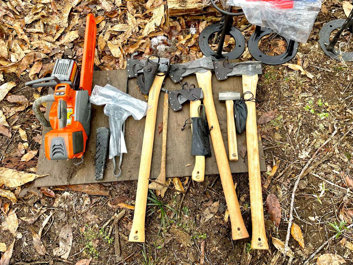 大きく足を開いて、斧を振り上げて一気に振り下ろします。狙ったところに、きちんと落とすだけなのに、想像よりもうまくいきません。 中村さん曰く、「精神集中するのがコツ」なんだそう。ご指導のおかげで、初めてでもなんとか成功!
