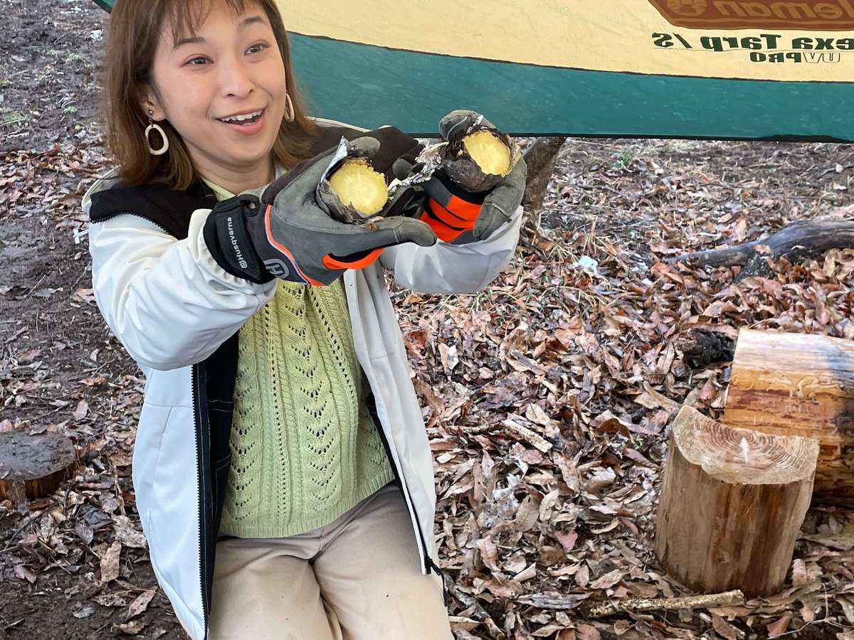 たき火と、アウトドアの相乗効果で、普段食べる焼き芋とは一味も二味も違いますね。