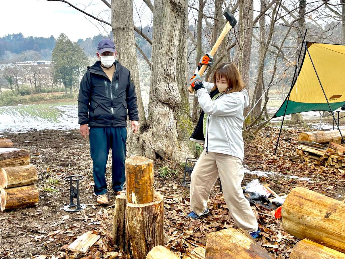 たき火の材料となる、薪(まき)割り体験もできちゃいます! 今回は特別に、牧場長の中村伸雄さんにやり方を教えていただきました。