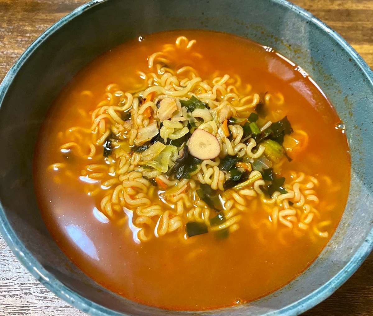 ピリッと辛さはあるものの、韓国系のピリ辛ラーメンの中でもマイルドな味わい◎。海鮮の旨味がギュッと凝縮されていて、インスタントラーメンながらかなり深みを感じられます。