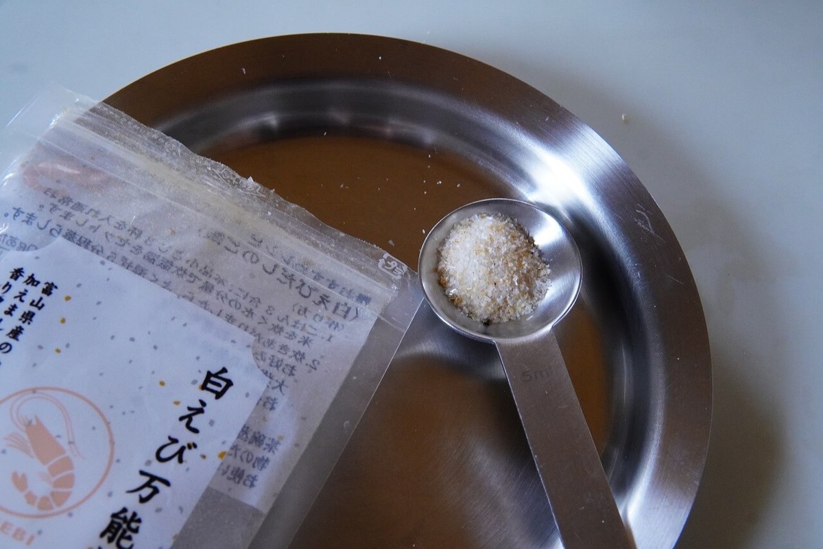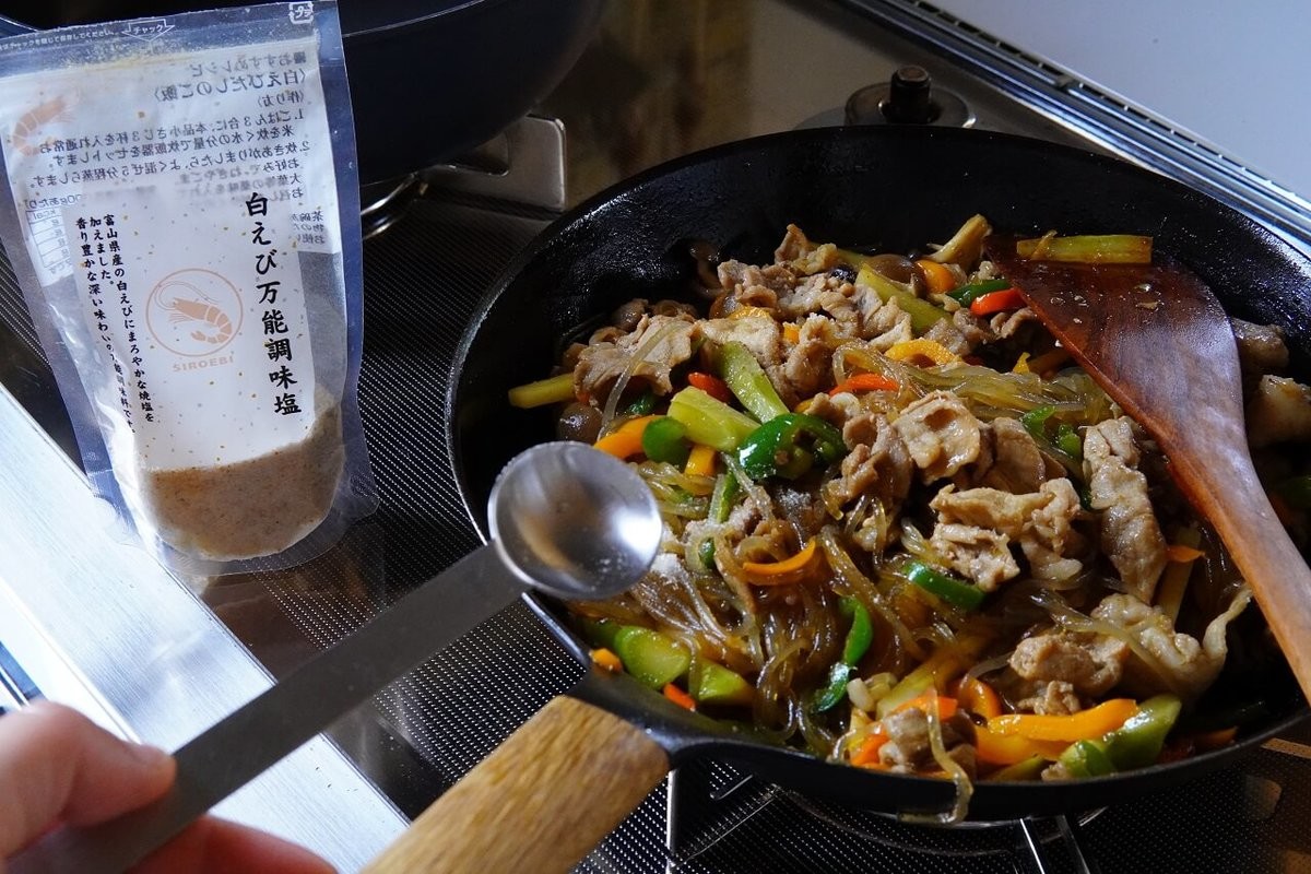 たまに味見して「何か少し足りない」という時に、白えび万能塩をパラパラ仕上げに入れるだけで、とたんに味が整います。