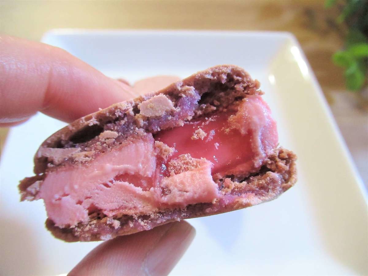 続いてベリー味を食べてみると、いちごアイスとサクホロ食感のマカロン生地の相性がいいですね。