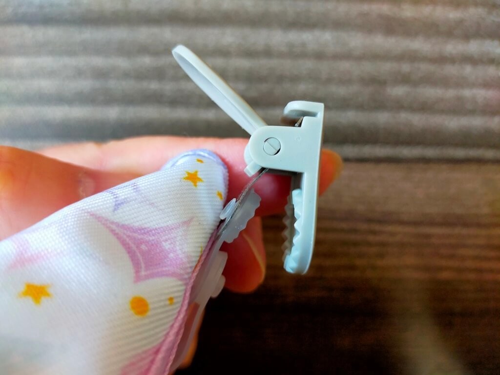 こちらの移動ポット、ズボンやスカートの部分に取り付けて使用します。取り付け方はとっても簡単、クリップを手前に引いて開き、ズボンやスカートに挟んでパチンと2ヶ所とめるだけ。