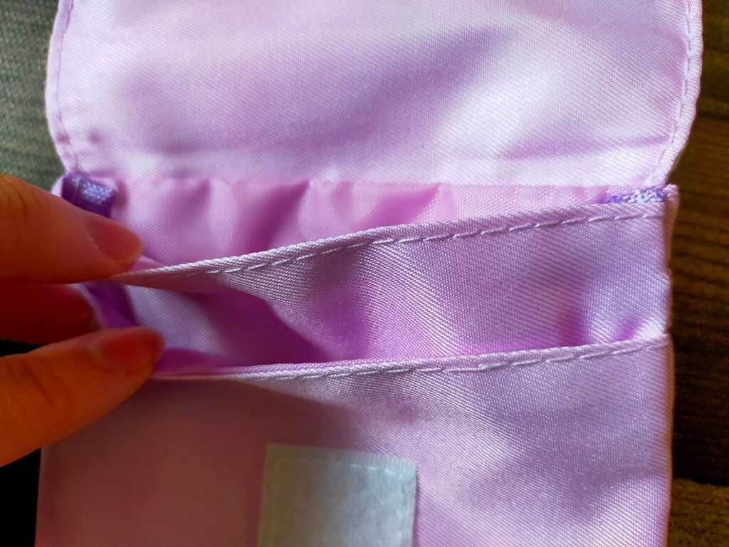 移動ポケットはマジックテープでとめるタイプなので、中に入れたものが飛び出しにくく、お子さんでも出し入れしやすくなっています。ポケットは2つあり手前が小さめとなっています。