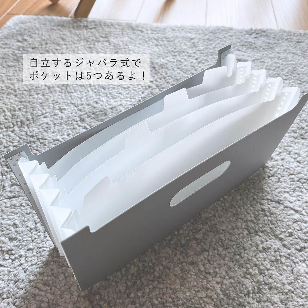 自立するジャバラタイプで5つに仕切ってあるので、例えば仕事書類、子どものプリント、支払い用紙......などと分けて収納することが可能なので、とにかくわかりやすい!