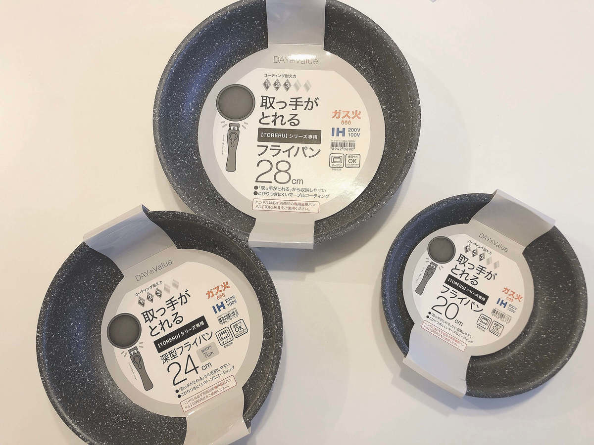 早速店舗に行くとラスト1つのものも含め、在庫少なめな「取っ手が取れるフライパン」がありました!実際に見た印象と、触った感じでコレは使えるかも!?と、「取っ手が取れるフライパン」シリーズで揃えちゃいました。