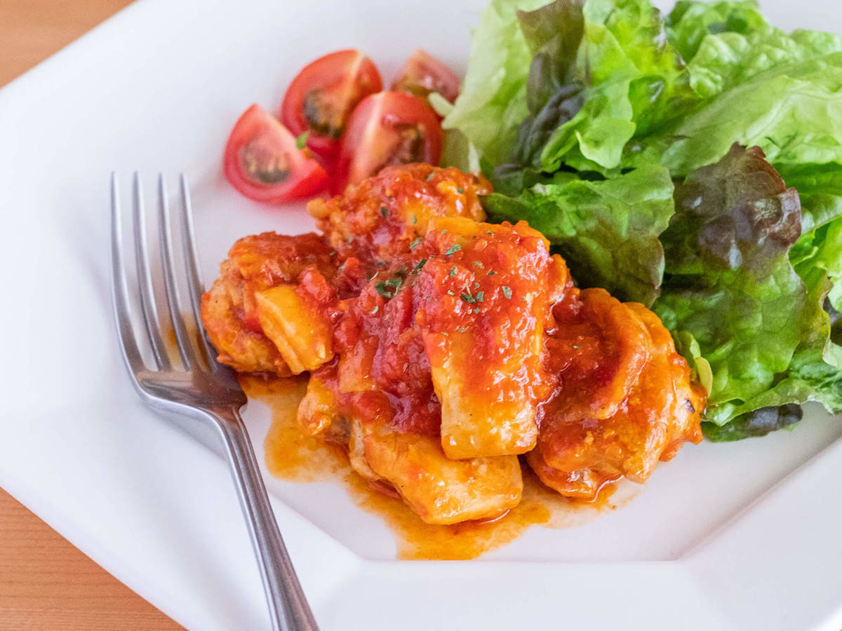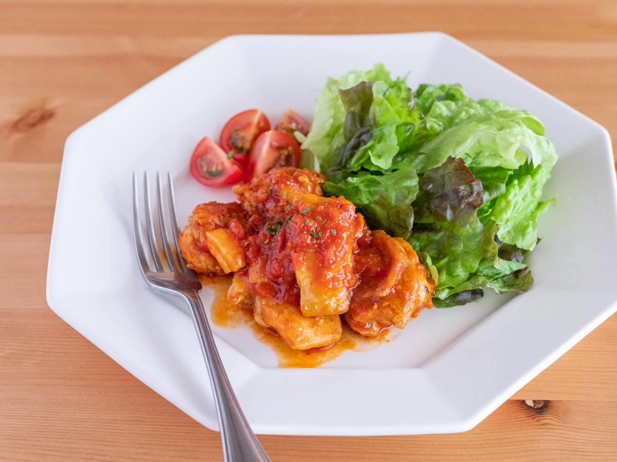 ひとくちサイズにカットしてからソテーしたチキンに「辛さ際立つ濃厚トマトソース アラビアータ」を絡めて、軽く煮込んで「チキンのアラビアータソース煮込み」を作ってみました。