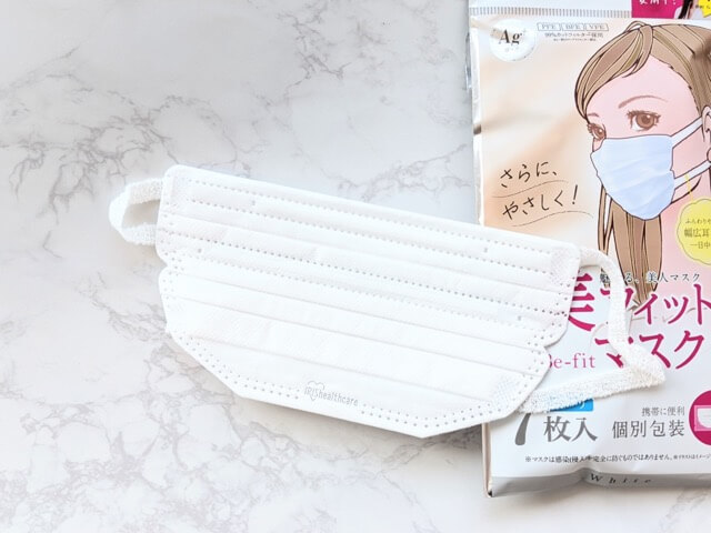一般的な長方形の不織布マスクとは設計が異なり、パタンと折りたたまれた立体型マスクです。