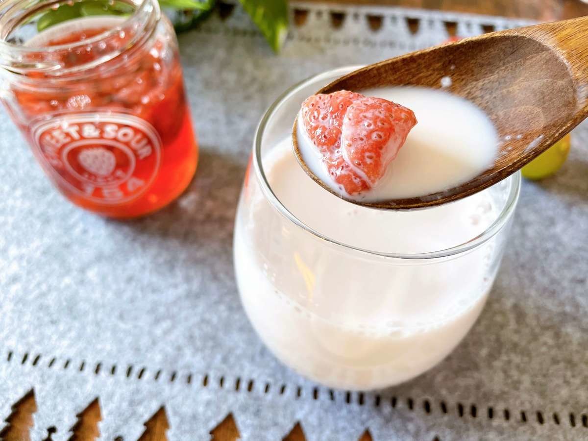 お酢の酸が牛乳のタンパク質と合わさりトロミが出て、まるで飲むヨーグルトのようです。とってもまろやかで優しい味わい。いちごは摘みたてのようなフレッシュで強い風味を感じます。