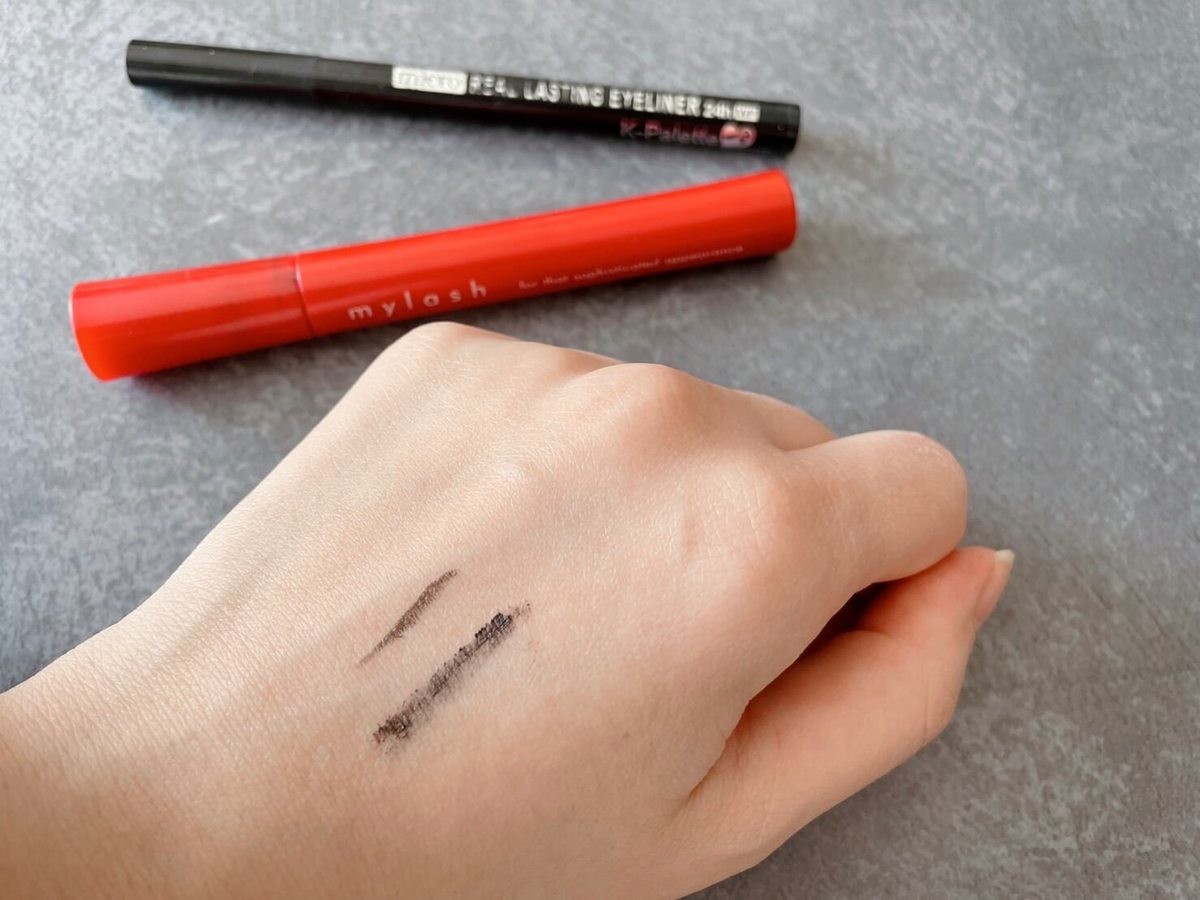 どれくらい落ちるのか普段私が使っているマスカ(下)ラとアイライン(上)で試してみましょう。