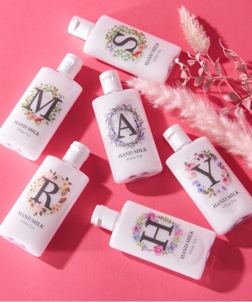 アルファベットが表記されたハンドミルクは、よく見るとパッケージのお花のデザインがひとつひとつ異なります。