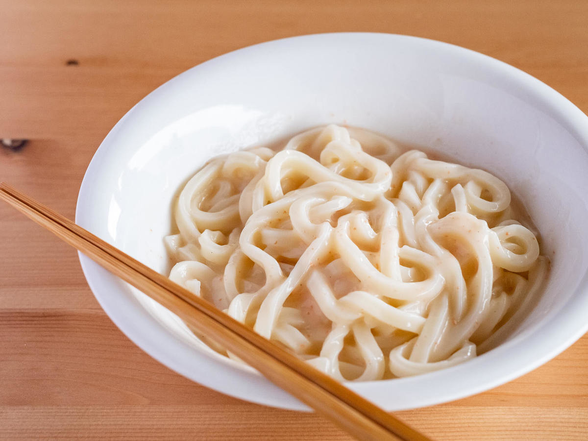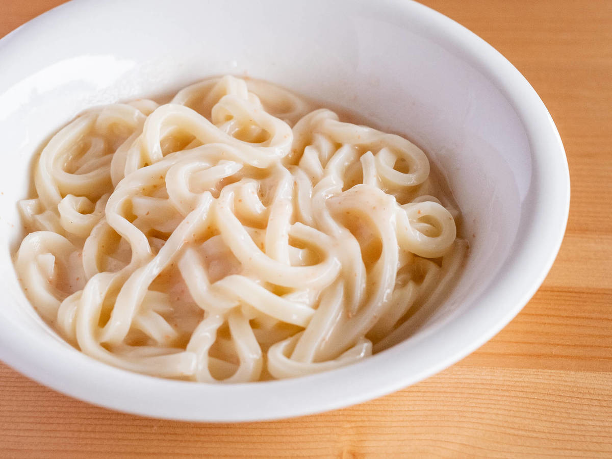 「たらこクリームうどんの素」は、ソース自体を温める必要がなく、常温のままの使用可能。茹でたうどんやレンチンしたうどんにかけるだけで完成します。