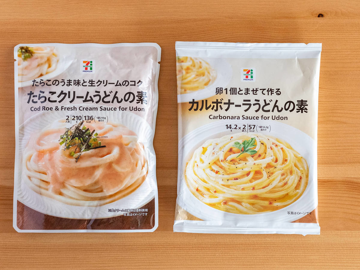 今回ご紹介するのは、セブンプレミアムの「卵1個とまぜて作る カルボナーラうどんの素」と「たらこのうま味と生クリームのコク たらこクリームうどんの素」。