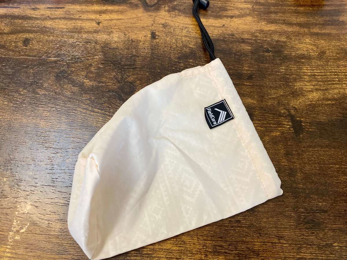 専用の収納袋が付いており、コンパクトにまとめられます。約210g(Lサイズ)ととても軽いので、リュックの中に入れていても邪魔になりません。