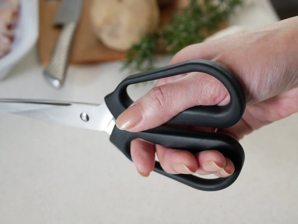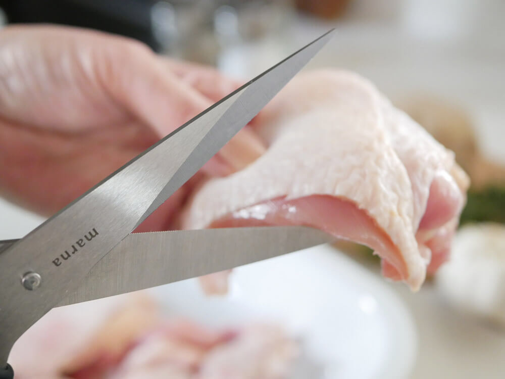 滑りやすい鶏皮やちょっと面倒なお肉の筋切りも、ハサミを使えばチョキンチョキン♪