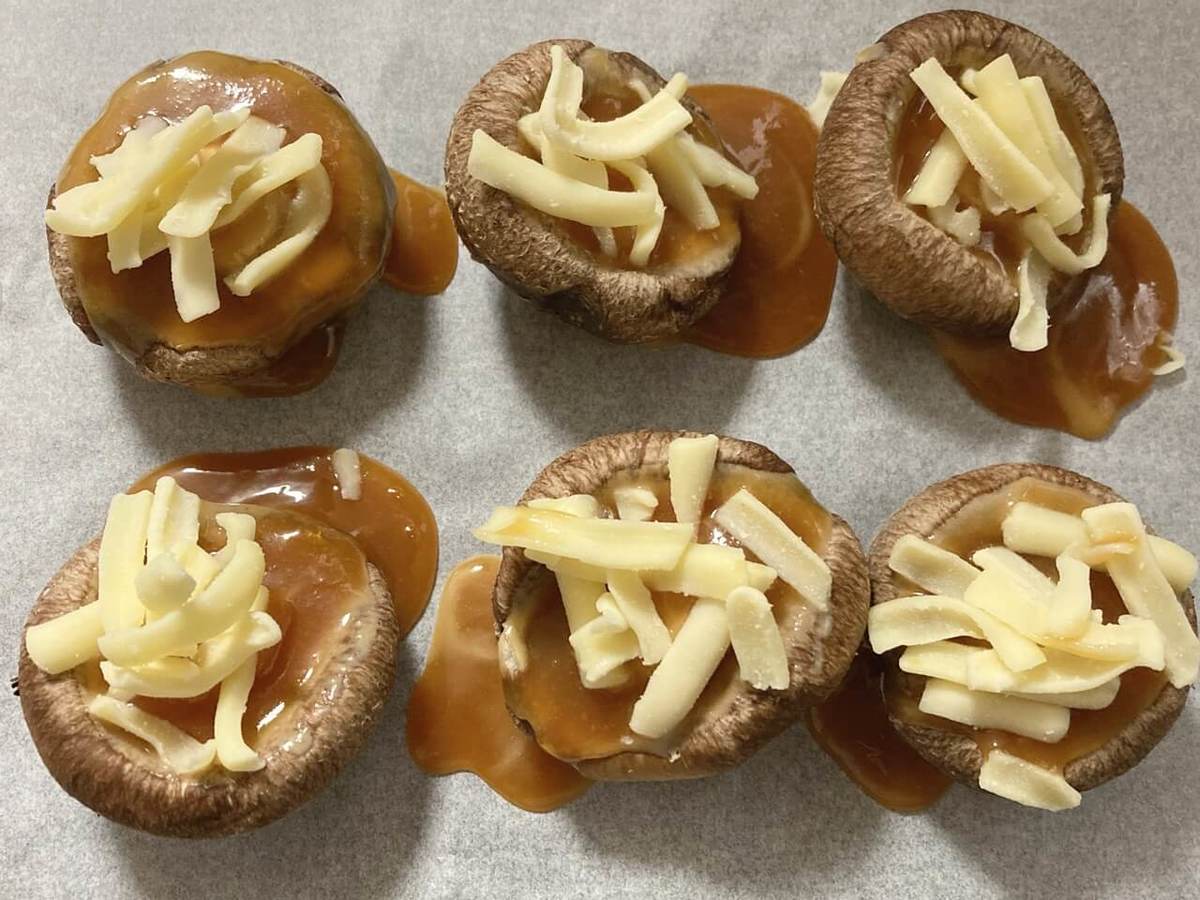 ②ゆず味噌(大さじ5)マヨネーズ(大さじ3)を混ぜてしいたけのかさの内側に塗り、その上からピザ用チーズ(適量)をかける