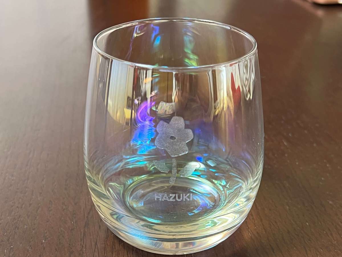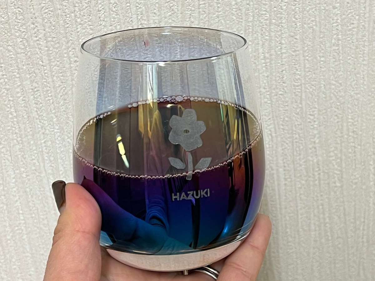 完成したオーロラグラスがこちら!飲み物を入れるとより刻印が浮き出て美しい!!私だけのオンリーワンとあって、他のグラスよりも愛着がわき、ヘビロテしています。