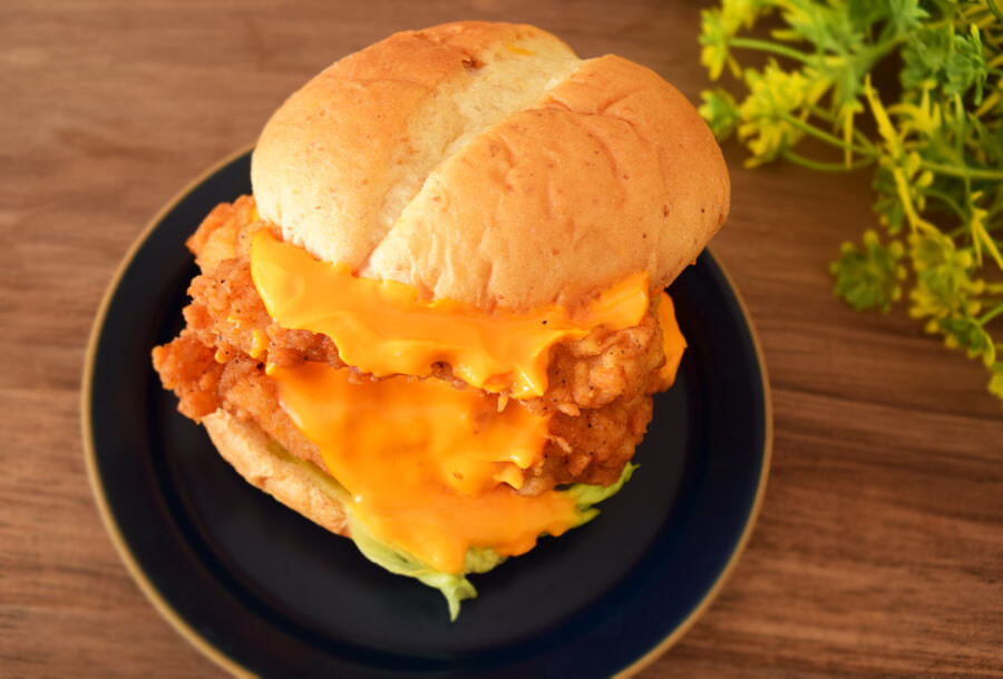 つづいて、「チーズにおぼれるダブルフィレサンド」690円(税込)も実食。チキンフィレが2枚重ねされています。見るからにチーズのインパクトがすごい。