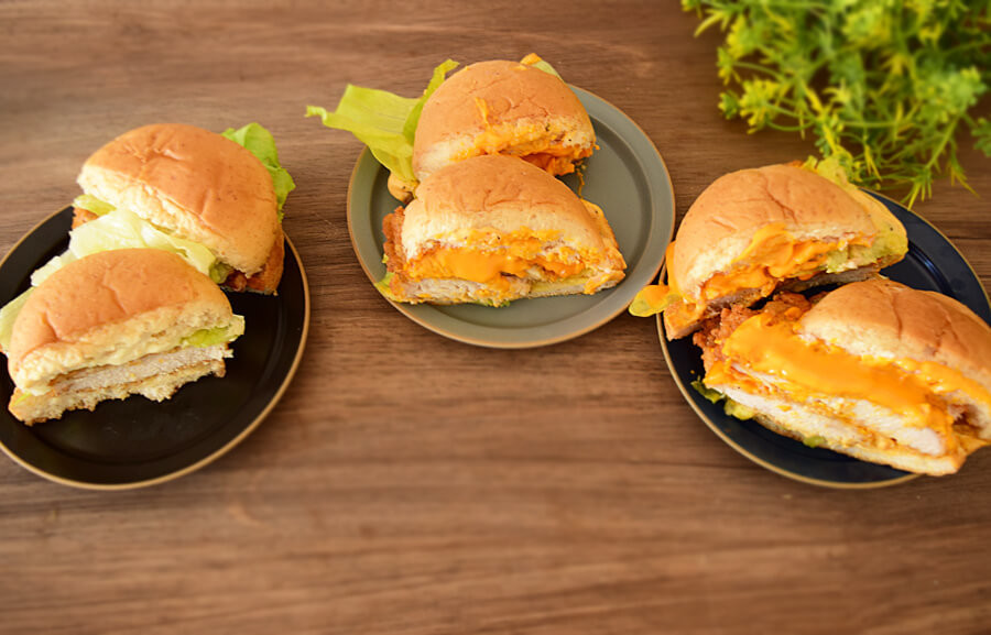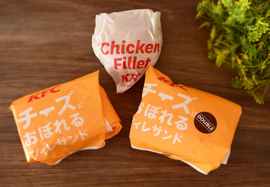 「チキンフィレサンド」「チーズにおぼれるフィレサンド」「チーズにおぼれるダブルフィレサンド」の3品を並べてみました。
