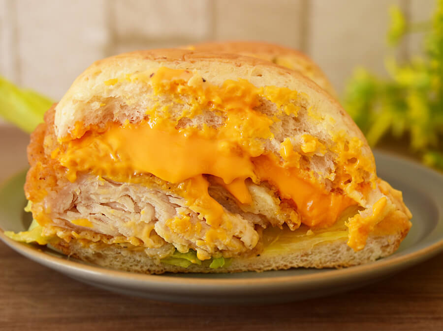 その名の通り、チーズにおぼれてしまったフィレサンドで、3種のチーズ(チェダー・クリーム・エメンタール)をブレンドしたチーズソースと、ガーリックとペッパーの風味がクセになるチーズソースの2種類がたっぷりかかっているフィレサンド。