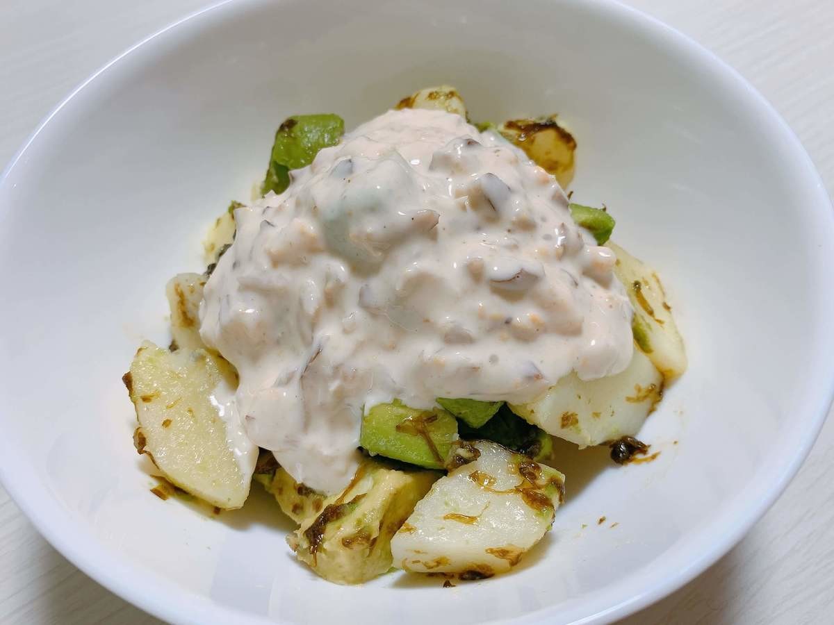 ゆでたじゃがいもとアボカドを海苔バターといぶりがっこタルタルで和えただけの簡単アレンジです。