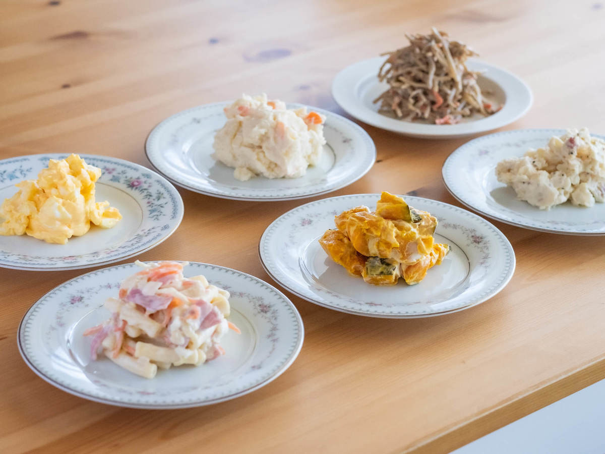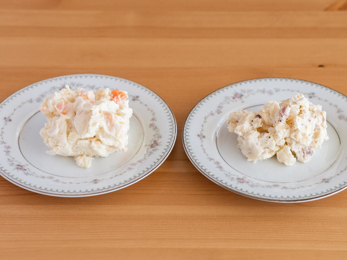 ポテトサラダ2種類を並べてみました。向かって左側がポテトサラダで、右側がベーコンポテトサラダです。