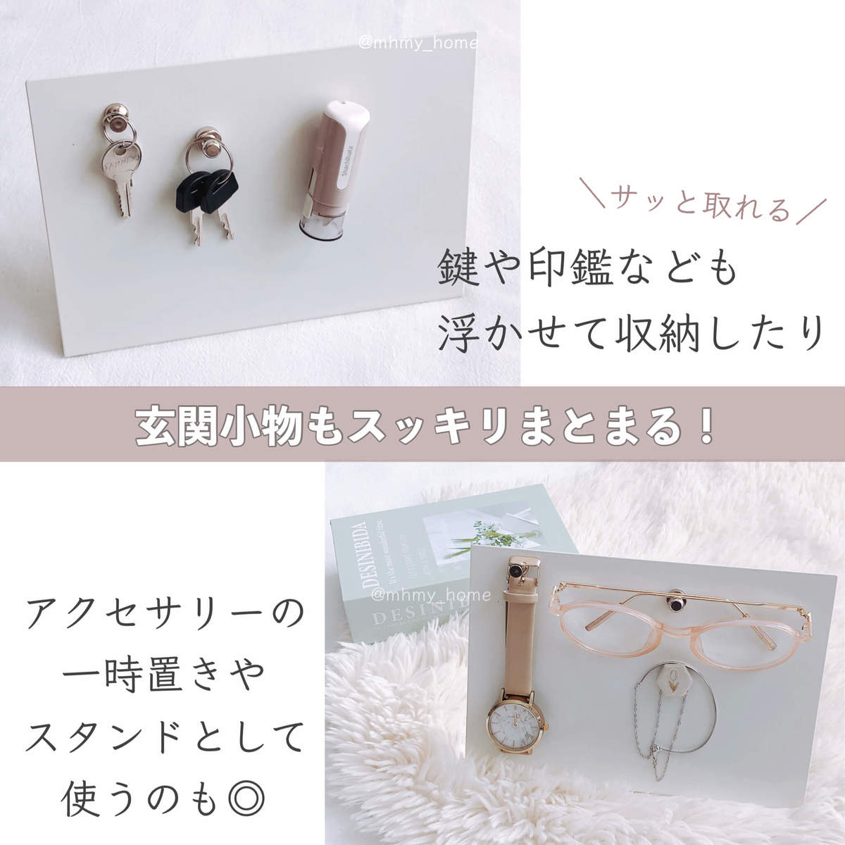 鍵や印鑑を浮かせておけば、玄関まわりもスッキリまとまり、必要な時にはサッと取れます。アクセサリーの一時置きやスタンドとして使うのも良いですね!