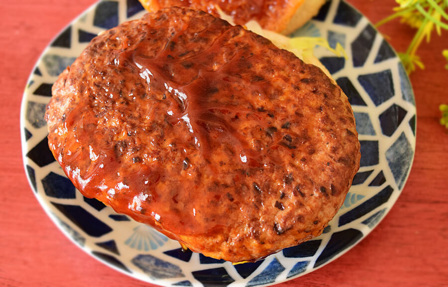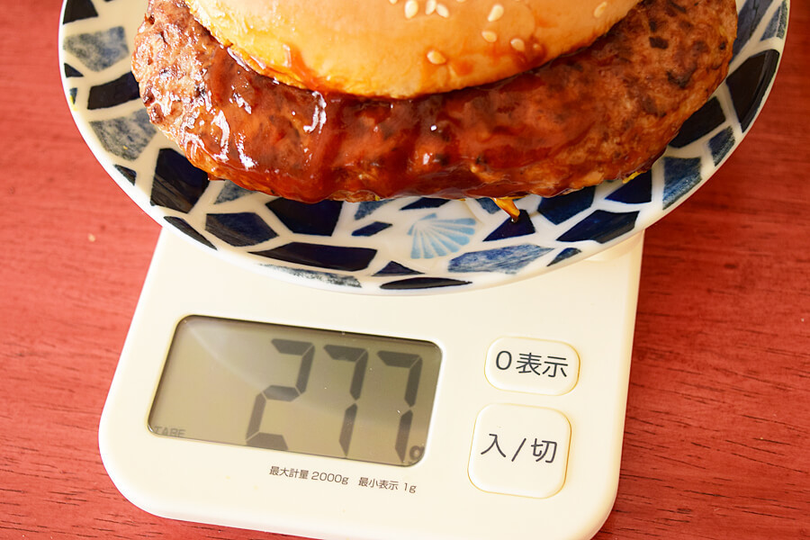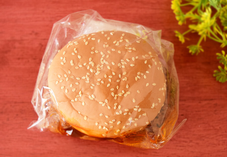 横からみてみると、無理やりサンドされた感のハンバーグが面白いですね。バンズはおまけなのかと思ってしまいました。