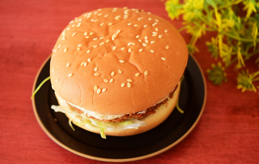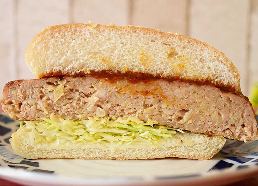 ハムカツはバンズにきっちりとおさまっています。とは言え、直径約10cmはあります。ハムカツの下には千切りキャベツ。