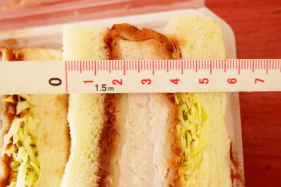 写真ではイマイチ伝わりにくいかもしれませんが、とにかくかつサンドの厚みが気になったので実食したら、約6cmありました。