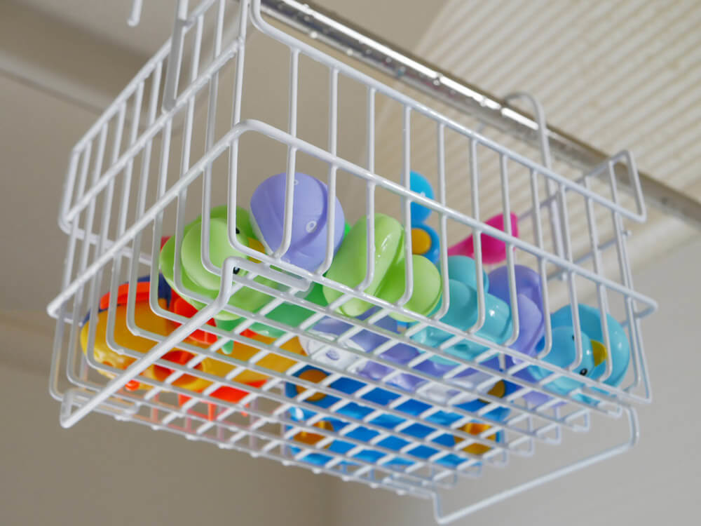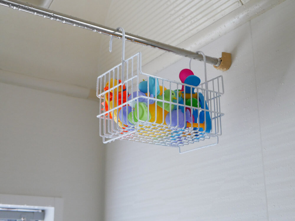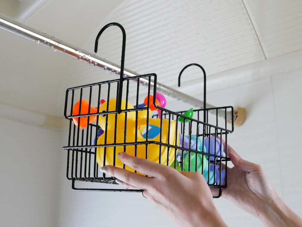 そんな億劫な作業はコレに頼ればOK! おもちゃをバスケットにドサッと入れて、既存の浴室バーに掛けるだけ。
